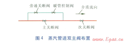 在可能的情況下,蒸汽管道暖管啟動后,盡可能待管道閥后蒸汽壓力達到閥前壓力時再開啟大口徑主閥,這樣可以保證大口徑閥門開啟過程中前后無壓差,大口徑閥門的密封面可得到有效的保護。如果蒸汽壓力較高(1.0MPa或以上)且無法做到利用旁通閥使閥后壓力達到或接近閥前壓力時開啟主閥,為保護大口徑主閥的密封面,可采取雙主閥的布置方法(見圖4)