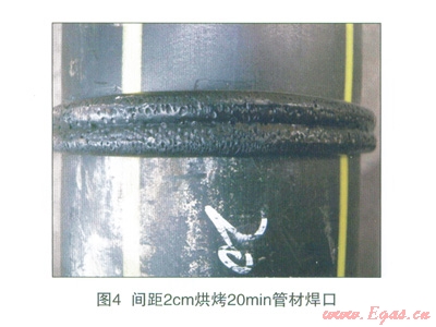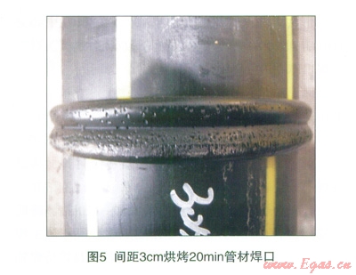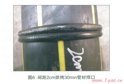烘烤溫度要求能烘出管材端面所含水分但不能過高導(dǎo)致管材端面熔融無法焊接。水的沸騰汽化溫度是100%,聚乙烯管材的熔融溫度是190℃,ME3440,PE80,中密度聚乙烯管材的焊接溫度(加熱板的溫度)為200%~220%,管材斷面到熱板吸熱面對距離為2cm~3cm的烘烤溫度適宜。烘烤時間不能超過聚乙烯管材的氧化時間,ME3440,PE80,巾密度聚乙烯燃氣管材的210℃氧化誘導(dǎo)時間為40min左右,取烘烤時間為20min、30min來進行試驗驗證,焊接中加熱板溫度為最低焊接溫度210℃,焊接效果見圖4、圖5。