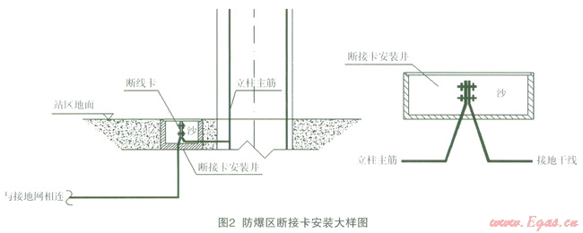 屋面避雷帶及接閃短桿均與建筑物鋼筋混凝土立柱內(nèi)主筋相焊接,鋼筋混凝土立柱內(nèi)(兩根不少于Æ16)主鋼筋做引下線(引下線采用綁扎連接),與接地網(wǎng)作可靠電氣連接。作引下線的立柱應(yīng)沿建筑物四周均勻布置,間距不得大于18m。很多設(shè)計(jì)員存距地面0.3m~0.5m的立柱上設(shè)斷接卡與站內(nèi)的人工接地網(wǎng)相連接,但壓縮機(jī)間、工藝罩棚立柱周圍都處于防爆區(qū),在防爆區(qū)內(nèi)直接設(shè)置斷接卡存在很大的安全隱患,所以防爆區(qū)內(nèi)引下線斷接卡應(yīng)采用防爆接線盒安裝,并用防爆膠泥密封,或者是設(shè)置在地面上,用干沙填實(shí)。尤其是LNG場站更需注意,因?yàn)?span lang="EN-US">LNG泄漏后迅速氣化而形成的低溫氣體比重較大,會(huì)聚集在地面附近,遇到斷接卡放電時(shí)極易發(fā)生爆炸。