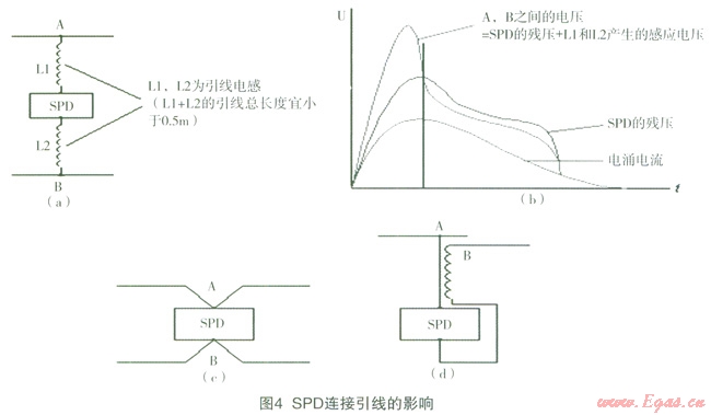在各級(jí)配電柜/箱及信息系統(tǒng)線路上安裝相應(yīng)級(jí)別的電涌保護(hù)器(SPD),以把雷電流及電氣系統(tǒng)故障電流盡可能地泄入大地,保護(hù)用電設(shè)備的安全。為使SPD安裝處呈現(xiàn)的最大電涌電壓足夠低,SPD兩端的引線應(yīng)做到最短(兩端引線總長度不宜大于0.5m),并且要避免形成過大環(huán)路,以獲得最佳保護(hù)效果。當(dāng)引線較長而產(chǎn)生的引線寄生感應(yīng)電壓較大時(shí),可采用圖4中(c)、(d)的接線,以轉(zhuǎn)移和補(bǔ)償引線的寄生電感,從而改善保護(hù)電路的性能[2]。