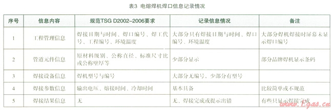 在焊口信息記錄方面,各品牌電熔焊機都具有數(shù)據(jù)檢索存儲功能,配置相應(yīng)的輸出接口(數(shù)據(jù)下載或打印接口),存儲容量高于標(biāo)準(zhǔn)和規(guī)范要求(不少于250個)。但是,與全自動熱熔焊機一樣存在信息不規(guī)范或不全的問題。對于具有可追溯性的焊口信息來說,應(yīng)至少包括工程管理、管道元件信息、焊接設(shè)備信息、焊接參數(shù)信息和焊接結(jié)果信息等5個方面。如表3所示,不少焊機記錄的焊口信息過于簡單和不規(guī)范。這既與目前相關(guān)標(biāo)準(zhǔn)和規(guī)范對此要求不夠具體有關(guān),又與對焊口信息對焊接工程管理重要性認識不足有關(guān)。