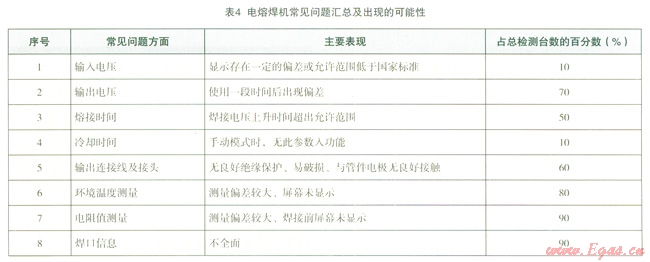 表4匯總了檢測過程中發(fā)現(xiàn)的常見問題以及占總檢測臺數(shù)的百分?jǐn)?shù)。其中常見的直接影響焊接質(zhì)量的問題主要是輸出電壓和環(huán)境溫度測量,而電阻值測量與焊口信息兩方面是電熔焊機普遍存在的問題。這應(yīng)引起焊機廠家與焊接質(zhì)量管理部門的重視。