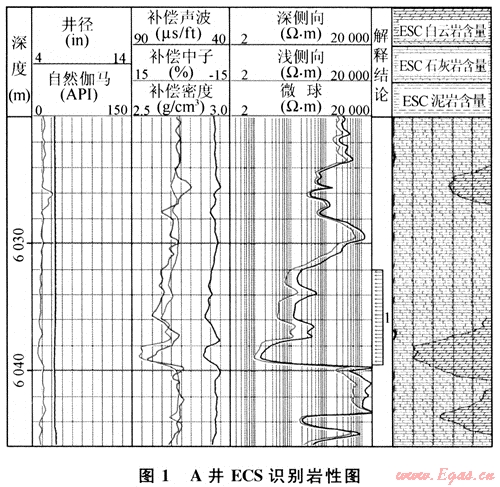 測井作業(yè)的主要任務(wù)之一是確定地層巖性[2],ECS可提供直觀的礦物類型及含量,因此,可直接應(yīng)用于評價(jià)地層巖性[3]。準(zhǔn)確的巖性分析對分析儲(chǔ)層是相當(dāng)重要的,如A井(圖1),在6032~6039.5m井段,常規(guī)測井資料指示該段孔隙較發(fā)育,初步分析該段為自云巖儲(chǔ)層;但通過ECS測井資料分析,該儲(chǔ)層段的6032~6037m巖性為石灰?guī)r儲(chǔ)層,僅6037~6039.5m為白云巖儲(chǔ)層。這個(gè)分析很重要,因?yàn)榘辞罢叻治?,該段整體為1個(gè)2類儲(chǔ)層,物性較好;而按ECS資料分析,該段僅6037~6039.5m為2類儲(chǔ)層,上部6032~6037m為3類儲(chǔ)層。通過此例可知,ECS精確測量的地層巖性結(jié)果對測井正確評價(jià)儲(chǔ)層物性是至關(guān)重要的。
