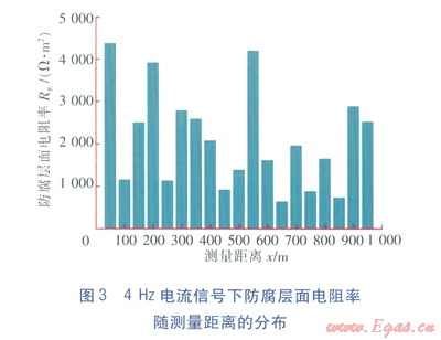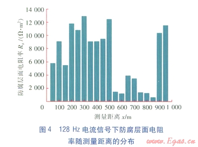 從圖3、4的測量結(jié)果來看,4Hz電流信號測量的結(jié)果,防腐層的質(zhì)量較差,平均面電阻率為2106W·m2;128Hz電流信號測量的結(jié)果,防腐層的平均面電阻率為6926W·m2。