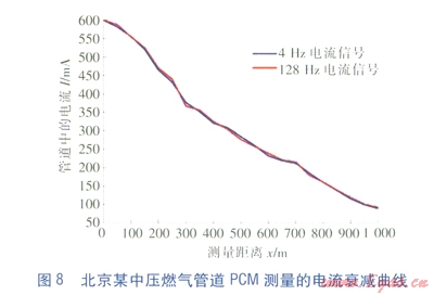從圖8可以看出,在野外環(huán)境中,受到干擾較小,4Hz和128Hz的電流衰減曲線基本一致,沒有出現(xiàn)較大波動的情況。利用評估軟件對燃?xì)夤艿赖姆栏瘜用骐娮杪蔬M行計算,4Hz電流信號的防腐層平均面電阻率的計算結(jié)果為8264W·m2;128Hz電流信號的防腐層面電阻率的計算結(jié)果為8697W·m2。對照組的實驗結(jié)果表明,在干擾較小的情況下,4Hz電流信號和128Hz電流信號的檢測結(jié)果差異不大。
