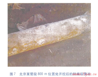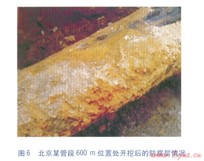 在128Hz電流測量信號的結(jié)果中(見圖4),在600m和800m左右的位置上,出現(xiàn)了防腐層質(zhì)量較差的情況,對兩處位置進行定位和開挖,開挖坑內(nèi)防腐層的情況分別見圖6、7。