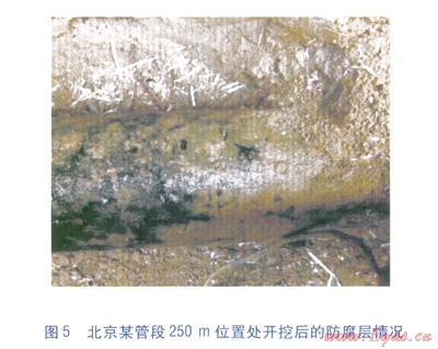 為了進一步對檢測結(jié)果的準(zhǔn)確性進行判斷和分析,這里采用了開挖驗證的方式。在4Hz電流信號測量結(jié)果中(見圖3),在距離起點約250m處附近出現(xiàn)了防腐層的面電阻率較低的現(xiàn)象,而l28Hz電流信號檢測的結(jié)果表明該處防腐層的質(zhì)量相對較好(見圖4)。結(jié)合ACVG對防腐層質(zhì)量較差的位置進行定位和開挖驗證,該處開挖坑內(nèi)防腐層的情況見圖5。