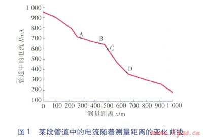 實際管道中的電流隨著測量距離變化的一般規(guī)律為:電流隨距離的增加而衰減,在管徑、管材、土壤環(huán)境不變的情況下,防腐層的絕緣性越好,電流損失越少,衰減亦越??;反之,若防腐層損壞,如老化、變質(zhì)、脫落等,絕緣性能越差,電流損失越嚴(yán)重,衰減也就越大。某段實際管道中的電流隨著測量距離的變化曲線見圖1。