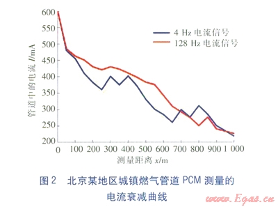 下面以北京某地區(qū)的燃?xì)夤艿罏槔M行分析。該段管道全長約1000m,防腐層的類型為石油瀝青,管道規(guī)格為DNl50mm。該管段所處環(huán)境比較復(fù)雜,有小區(qū)、道路等,受干擾較為嚴(yán)重。PCM檢測時,信號發(fā)射機發(fā)射的電流為600mA,信號類型為ELCD。在對防腐層進行檢測時,分別選擇了4Hz電流信號和128Hz電流信號的檢測結(jié)果進行比對,該段管道PCM測量的電流衰減曲線見圖2。