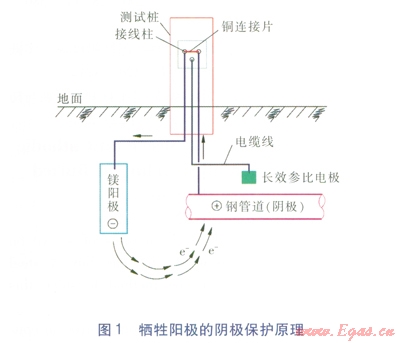陰極保護(hù)分犧牲陽極陰極保護(hù)法和外加電流陰極保護(hù)法。綠博公司主管道采用的是犧牲陽極陰極保護(hù)法,其原理就是原電池的原理,是將一種比鐵更活潑的鎂陽極與被保護(hù)的鋼管相連接,通過鎂陽極的不斷氧化反應(yīng),向被保護(hù)的鋼管提供保護(hù)電子,使其獲得保護(hù)。犧牲陽極陰極保護(hù)原理見圖l
