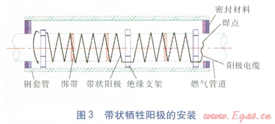 不可避免使用套管時(shí),可在套管內(nèi)部采取局部的陰極保護(hù)也是一種很有效的辦法。具體做法是:在套管內(nèi)的主管道上纏繞鎂陽極帶或鋅陽極帶或安裝鐲式陽極[4]。當(dāng)主管道外防腐層為3PE防腐時(shí),推薦使用纏繞鎂陽極帶的局部陰極保護(hù)。安裝鎂陽極帶時(shí),可采用機(jī)械打磨的方法,露出里面的鋼管約35cm癌主管道上開鑿一個(gè)合適的焊點(diǎn),采用電焊、鋁熱焊等焊接方式把鎂陽極帶一端焊接到主管道上,根據(jù)不同的管徑按照一定的角度和間距,貼著管道的外壁緊緊纏繞。針對(duì)不同管徑,鎂陽極帶有不同的纏繞角度:當(dāng)燃?xì)夤艿劳鈴?le;219mm時(shí),鎂陽極帶沿管道外壁等距且與管道軸向成30°角纏繞;當(dāng)燃?xì)夤艿劳鈴綖?span lang="EN-US">219377mm時(shí),沿管道外壁等距且與管道軸向成45°角纏繞;當(dāng)燃?xì)夤艿劳鈴?ge;377mm時(shí),沿管道外壁等距且與管道軸向成600角纏繞[4]。鎂陽極帶另一端也要和起點(diǎn)一樣,焊接在主管道上,而且兩個(gè)焊點(diǎn)都要做好絕緣防腐。鎂陽極帶纏繞施工完畢,套管兩端應(yīng)采用柔性的防腐、防水材料密封,并保證密封良好,防止水或其他雜物的進(jìn)入。纏繞鎂陽極帶法的優(yōu)點(diǎn)是施工簡(jiǎn)單方便,缺點(diǎn)是鎂的電位較負(fù),保護(hù)年限不是很長(zhǎng)[4]。帶狀犧牲陽極的安裝見圖3