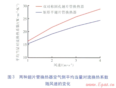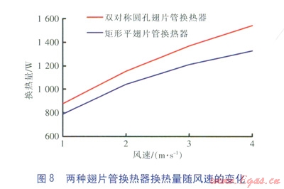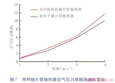 對(duì)稱圓孔翅片管具有優(yōu)越的強(qiáng)化傳熱效果。風(fēng)速范圍為l4ms時(shí),與矩形平翅片管換熱器相比,對(duì)稱圓孔翅片管換熱器的換熱量平均提高了12.8%,空氣壓力降提高并不明顯。
