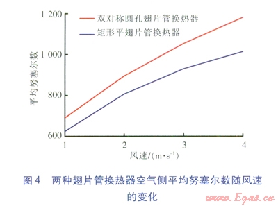 兩種翅片管換熱器空氣側(cè)平均努塞爾數(shù)隨風(fēng)速的變化見圖4。由圖4可知,隨著風(fēng)速的增大,兩種翅片管換熱器空氣側(cè)平均努塞爾數(shù)均明顯增大,且相同風(fēng)速下雙對(duì)稱圓孔翅片管換熱器空氣側(cè)平均努塞爾數(shù)明顯高于矩形平翅片管換熱器。