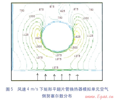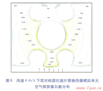 風(fēng)速4ms下兩種模擬單元空氣側(cè)努塞爾數(shù)分布見圖5、6。由圖56可知,矩形平翅片管換熱器模擬單元空氣側(cè)努塞爾數(shù)的最大值出現(xiàn)在換熱管的兩側(cè),雙對(duì)稱圓孔翅片管換熱器模擬單元的最大值出現(xiàn)在流動(dòng)的起始位置;最小值均出現(xiàn)在換熱管后尾流區(qū)。在相近位置上,雙對(duì)稱圓孔翅片管換熱器模擬單元空氣側(cè)努塞爾數(shù)明顯高于矩形平翅片管換熱器模擬單元,這說明前者的傳熱性能優(yōu)于后者。