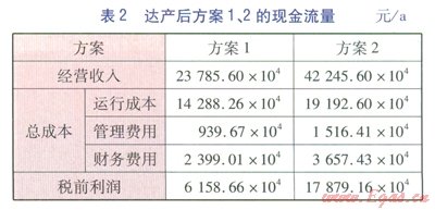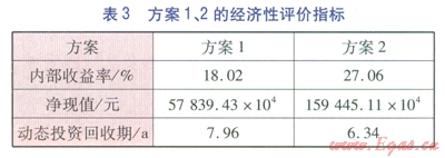 本文采用內(nèi)部收益率(稅前)、凈現(xiàn)值(稅前)、動(dòng)態(tài)投資回收期(稅前)作為方案經(jīng)濟(jì)性評(píng)價(jià)指標(biāo)。內(nèi)部收益率的經(jīng)濟(jì)含義是項(xiàng)目在其壽命期內(nèi)未回收資金的預(yù)計(jì)收益率,項(xiàng)目投入運(yùn)營(yíng)后,投資額將通過(guò)每年所產(chǎn)生凈效益的形式逐步得到回收。已回收部分將用于再投資,未回收部分待繼續(xù)回收,內(nèi)部收益率就是指未回收部分的收益率,因此稱為內(nèi)部收益率。凈現(xiàn)值的經(jīng)濟(jì)含義是項(xiàng)目在其壽命期內(nèi)預(yù)計(jì)創(chuàng)造的全部?jī)粜б?。?nèi)部收益率、凈現(xiàn)值都是反映項(xiàng)目贏利能力的指標(biāo),前者體現(xiàn)的是相對(duì)贏利能力,后者體現(xiàn)的是絕對(duì)贏利能力。內(nèi)部收益率、凈現(xiàn)值越大,項(xiàng)目贏利能力越強(qiáng)。動(dòng)態(tài)回收期越短,說(shuō)明項(xiàng)目收回投資額的時(shí)間越短。方案1、2的經(jīng)濟(jì)性評(píng)價(jià)指標(biāo)見(jiàn)表3。由表3可知,方案2的內(nèi)部收益率、凈現(xiàn)值均高于方案l,且方案2的動(dòng)態(tài)投資回收期短于方案l,這說(shuō)明方案2的經(jīng)濟(jì)性優(yōu)于方案l。