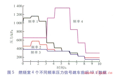 燃燒室4個不同頻率壓力信號跳車前后10s數(shù)據(jù)如圖5所示,這4個壓力信號表征燃燒室火焰振蕩特征頻段的強度。頻率l、頻率2、頻率3、頻率4代表頻率依次降低。從圖5可以看出,在2s左右,高頻段頻率1、頻率2的值突降,圖3和圖4中7號燃燒室的溫度也突然降低;3s左右,高頻段強度進一步降低,低頻段信號頻率4突然增強,7號燃燒室的溫度也再次下降;4s左右,這一趨勢進一步加強,7號燃燒室溫度也進一步降低;6s以后,所有頻段的信號強度都減弱,這是因為主、輔燃料閥都已經(jīng)關(guān)小,燃燒室功率下降。從以上變化趨勢可以看出,火焰高頻振動減弱、低頻振動加強代表燃燒不穩(wěn)定的增強,最后導致火焰被吹滅,燃燒室溫度下降。該廠現(xiàn)場操作人員也反映,燃氣輪機運行過程中除了正常的運行噪聲外,還有周期性的轟隆聲,這些外部表現(xiàn)與燃氣輪機熱聲振蕩燃燒現(xiàn)象非常相似。周期性的燃燒不穩(wěn)定,并且出現(xiàn)較大振幅的壓力波動,這種現(xiàn)象通常稱為熱聲振蕩燃燒。