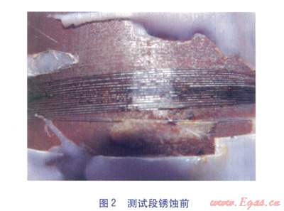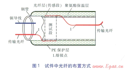 試件為一段長度為200mm的鋼管(材質(zhì)為Q235),對銹蝕測試段外壁進(jìn)行拋光處理,拋光后測試段外直徑為73.8mm,壁厚為3.5m。試件中光纖的布置方式見圖l。在距鋼管端面50mm處纏繞光纖層(傳感段),纏繞時使光纖帶有一定的預(yù)應(yīng)力,保證光纖與鋼管表面緊密接觸,纏繞的光纖總長度在4m左右。將光纖用環(huán)氧樹脂膠固定在鋼管上,傳感段的引出端與帶保護(hù)套的傳輸光纜熔接,將熔接處進(jìn)行保護(hù)處理,并在鋼管兩端的引出位置用環(huán)氧樹脂膠進(jìn)行固定。光纖設(shè)置完畢后,在鋼管與PE保護(hù)管間進(jìn)行發(fā)泡處理。