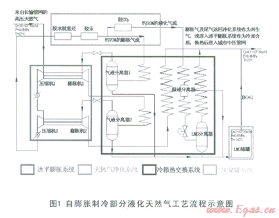 (2)自膨脹制冷部分液化天然氣工藝流程主要包括:原料天然氣的過(guò)濾、計(jì)量及加壓,原料天然氣的凈化,30%凈化天然氣的液化,70%膨脹氣流的制冷;主要設(shè)備系統(tǒng)則包括:天然氣凈化系統(tǒng),透平膨脹系統(tǒng),冷箱熱交換系統(tǒng),以及LNG儲(chǔ)罐系統(tǒng)。
