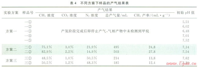 可見(jiàn),方案一在產(chǎn)氫完畢后不能再繼續(xù)產(chǎn)甲烷,而方案二和方案三均可實(shí)現(xiàn)產(chǎn)氫后再連續(xù)產(chǎn)甲烷,且方案二的甲烷產(chǎn)率要遠(yuǎn)遠(yuǎn)高于方案三。方案一未產(chǎn)甲烷主要是因?yàn)樵诟患l(fā)酵產(chǎn)氫菌以及厭氧發(fā)酵產(chǎn)氫的過(guò)程中,發(fā)酵產(chǎn)氫菌生成了大量的酸性物質(zhì),使反應(yīng)液的pH值過(guò)低(3),從而抑制了產(chǎn)甲烷菌的活性,甚至使其死亡;方案二是由于在產(chǎn)氫結(jié)束后調(diào)整了反應(yīng)液的pH值至中性范圍內(nèi),使得反應(yīng)體系中的產(chǎn)甲烷菌被激活,從而大量繁殖并產(chǎn)生甲烷;方案三也產(chǎn)生了一定量甲烷,但其甲烷產(chǎn)率明顯低于方案二,是因?yàn)橄蚍磻?yīng)液中直接補(bǔ)加新鮮地層水這種處理方式使得原反應(yīng)體系中的有機(jī)物和無(wú)機(jī)物的濃度降低,產(chǎn)甲烷菌等微生物對(duì)營(yíng)養(yǎng)物質(zhì)的可獲得性降低,從而降低了產(chǎn)甲烷菌等微生物的代謝活性。