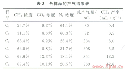 單獨(dú)發(fā)酵產(chǎn)甲烷工藝大約在第15天后才開(kāi)始有甲烷產(chǎn)生,產(chǎn)氣持續(xù)時(shí)間約為30d,本實(shí)驗(yàn)于第35d測(cè)試各樣品的產(chǎn)氣結(jié)果(3)。