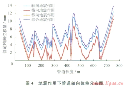 46為地震作用下管道軸向、橫向及縱向位移沿管長的分布情況,圖7為靜態(tài)及地震作用下應(yīng)力沿管長的分布情況,由圖47可以得出以下結(jié)論: