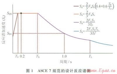 頻譜分析法中頻譜的設(shè)計與取值通常參照美國土木工程師學(xué)會ASCE 705《建筑物和其他結(jié)構(gòu)的最低設(shè)計載荷規(guī)范》(Minimum Design Loads for Buildings and Other Structures)[14],相對我國的GB 50011《建筑抗震設(shè)計規(guī)范》其取值較為保守[]15]。圖1ASCE 7規(guī)范的設(shè)計反應(yīng)譜示意圖,它的周期區(qū)間分為4個,不同的區(qū)間所對應(yīng)的反應(yīng)譜加速度計算公式不同(1中列出),其中,SDSSD1用于選擇抗震設(shè)計類別和分析方法。