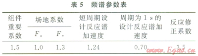 根據(jù)XX管道給出的地震資料,可根據(jù)GB 5001l《建筑抗震設(shè)計規(guī)范》查得土地的特征周期、水平地震影響系數(shù)最大值等參數(shù),根據(jù)SS(4%阻尼系數(shù))S1(4%阻尼系數(shù))的值,分別在ASCE 7-05規(guī)范中表11.4.111.4.2查得場地系數(shù)FaFv。在CAESARⅡ軟件的頻譜分析模塊輸入相關(guān)的地震頻譜參數(shù),軟件計算后會生成頻譜分析結(jié)果圖。XX管道所在的地震區(qū)域頻譜參數(shù)如表5所示,頻譜分析結(jié)果如圖3所示,工況組合情況如表6所示[18-22]。