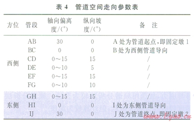 管道總長度約為780m,起點和終點分別設(shè)置固定墩l2,用以截斷研究對象外管道對模型的影響。西側(cè)進(jìn)土導(dǎo)向B前有30m長的管段,與入土處有30°的偏離;西側(cè)水平管段長約為110m,斜管總長約為215m;東側(cè)出土導(dǎo)向工后有30m長的管段,與出土處有30°的偏離;東側(cè)水平管段長為105m,斜管長約為290m。管道均采用大開挖的敷設(shè)方式,彎管的曲率半徑(R)6D(D為管道外徑),地區(qū)等級為l級,設(shè)計系數(shù)為0.72。管道為空間結(jié)構(gòu),在X、YZ方向上均有長度分量,其在XOY平面上的走向如圖2所示,具體空間參數(shù)如表4所示。