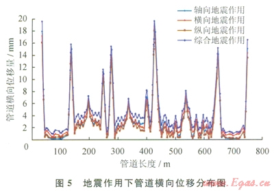 1)軸向、橫向、縱向及綜合地震作用對管道的橫向位移影響最大,且最大橫向位移明顯高于最大軸向及縱向位移,說明輸氣管道在穿越地震帶時,應(yīng)重點對管道的橫向位移量進(jìn)行監(jiān)測。