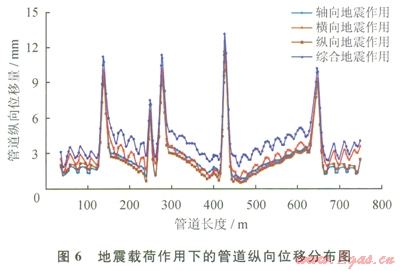 3)地震作用下最大縱向位移和橫向位移均產(chǎn)生在坡頂(彎管6),設(shè)計時需重點對坡頂?shù)奈灰屏窟M(jìn)行校核,由于地震載荷是通過土壤作用于管道,可通過降低土壤壓實度的方式減少地震發(fā)生時管道的破壞。