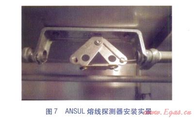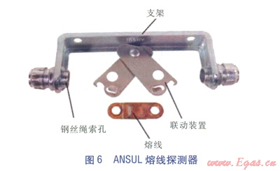 熔線探測器(見圖6)。熔線探測器布置在保護區(qū)的上方,通過額定溫度的合金熔線進行自動探測,當(dāng)溫度超過額定溫度時,熔線斷開,鋼絲繩索松開。其安裝圖見圖7。