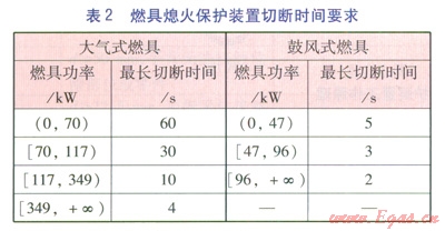 在工程實踐中,要求在燃具的每個燃燒器上都設(shè)置獨立的熄火保護裝置。另外,熄火保護裝置從檢測到?jīng)]有火焰到給出有效信號切斷燃?xì)夤?yīng)的整個操作過程必須是在安全合理的時間內(nèi),因為此操作過程時間過長,燃具泄漏的燃?xì)膺^多,危險性過高,保護裝置就失去了意義。對于不同類型及功率燃具的熄火保護裝置的最長切斷時間,澳門地區(qū)的相關(guān)燃?xì)夥ㄒ?guī)要求見表2。