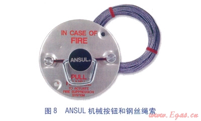 機械按鈕(見圖8)。是手動啟動滅火系統(tǒng)的操作工具,通過鋼絲繩索管連接到釋放裝置。機械按鈕拉環(huán)設(shè)計成允許三個手指操作,并有紅色字樣標(biāo)志,方便快速辨認(rèn)。