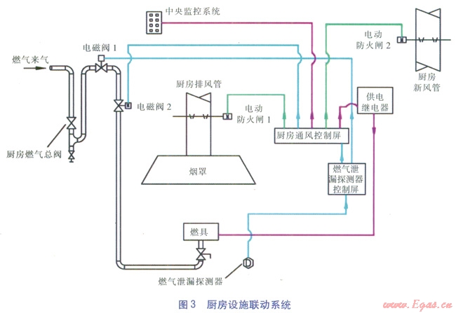 由于在商業(yè)廚房內(nèi)安裝燃?xì)庠O(shè)施種類及數(shù)量較多,需要防止燃?xì)庑孤?,同時在廚房火災(zāi)發(fā)生時,若有燃?xì)庵紕t火災(zāi)更加難以控制,造成的災(zāi)難更大?;诎踩珳?zhǔn)則,工程實踐中,通常在商業(yè)廚房的燃?xì)饪傞y的下游設(shè)置一組電磁閥,與燃?xì)庑孤┨綔y器、廚房通風(fēng)管道內(nèi)的電動防火閘、供電繼電器聯(lián)動。當(dāng)燃?xì)庑孤┨綔y器偵測到泄漏發(fā)生時,發(fā)出報警,電磁閥關(guān)閉、電動防火閘關(guān)閉、供電繼電器切斷廚房燃具電源。由上述設(shè)備組成的廚房聯(lián)動系統(tǒng)同時切斷了可燃物燃?xì)?、助燃物空氣的供?yīng)以及消除可能存在的點火源。電動防火閘的關(guān)閉則更是可以遏制火災(zāi)經(jīng)通風(fēng)管道向其他地方蔓延。廚房設(shè)施聯(lián)動系統(tǒng)見圖3