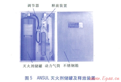調(diào)節(jié)型釋放裝置。屬于一種裝有彈簧的機械、氣動釋放裝置,配置一個儲存二氧化碳或氮氣的動力氣筒,向滅火劑儲罐提供動力氣供應(yīng),氣筒上安裝有調(diào)節(jié)器,氣筒的密封層設(shè)計成由釋放裝置擊穿。釋放裝置由熔線探測系統(tǒng)進行自動啟動,釋放裝置還可以通過鋼絲繩索連接設(shè)置在保護區(qū)以外的機械按鈕進行遙控手動開啟,另外可與大廈中央監(jiān)控系統(tǒng)的連接線兼容,將有關(guān)信號自動傳輸?shù)酱髲B中央監(jiān)控系統(tǒng)。ANSUL滅火劑儲罐及釋放裝置見圖5。