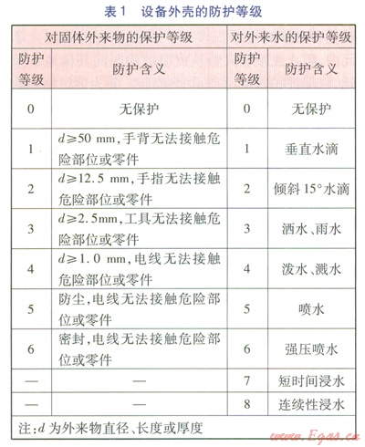 國際防護符號IP,即Ingress Protection Rating(防護等級),或International Protection Rating(國際保護等級),表示裝置外殼的防護等級,由IP和后續(xù)的兩位數(shù)字組成。第一個數(shù)字為06,表示對固體外來物的保護等級,第二個數(shù)字為08,表示對外來水的保護等級,數(shù)字越大表示防護等級越高。國際電工技術(shù)委員會(International Eleetroteehnical Commission,IEC)標(biāo)準(zhǔn)IEC 529《外殼所提供的保護等級》(Degrees of Protection Provided by Enclosure)的相關(guān)規(guī)定見表1。