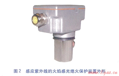 火焰感光熄火保護裝置利用火焰的光特性,采用感光式電子火焰?zhèn)鞲衅?,吸收火焰輻射強度高的紅外線或紫外線,來探測或掃描火焰。代表火焰信號的初始電流經(jīng)放大后推動執(zhí)行繼電器。該類型熄火保護裝置的特點是探測器分辨火焰輻射來獲得正確的火焰信號,不需要接觸火焰,配置探頭變得很簡單。不需要火焰電極,探頭在高溫下不退化。另外,由于所有熱的物質(zhì)都向外輻射紅外線,感應(yīng)紅外線的火焰檢測裝置存在缺點,即難以區(qū)分究竟是火焰輻射還是燃燒室受熱表面輻射(即使火焰熄滅),因此火焰檢測裝置的設(shè)計優(yōu)選感應(yīng)紫外線。感應(yīng)紫外線的火焰感光熄火保護裝置見圖2