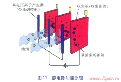 靜電除油器(見圖11),其原理是油煙進入高壓電場,使油煙粒子帶電,在電場力作用下凝聚成油滴,沉積在收集板上,經(jīng)重力自流從而得到凈化。凈化過程的分離力直接作用于油煙粒子上,而不是作用于整個氣流上。因此,靜電除油器具有凈化效率高、壓降小的特點。收集板是其中一個非常重要的部件,須定期清理以確保靜電除油器的性能。