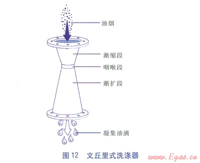 文丘里式洗滌器(見圖l2)由三段組成:漸縮段、咽喉段和漸擴段。把油煙氣流壓入文丘里式洗滌器,當(dāng)油煙進入漸縮段后,流速增大,進入咽喉段時達(dá)到最大值。洗滌液噴霧則從咽喉段加入,將其清洗。在漸擴段,流速減小,壓力回升,油煙粒子凝聚成直徑較大的液滴,進而被收集。