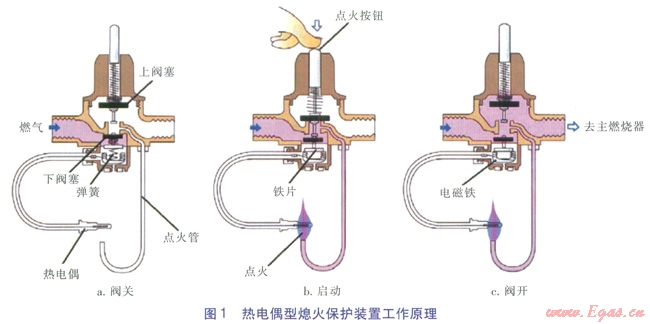 熱電偶熄火保護裝置的工作過程如圖l所示。當(dāng)燃具不工作時,下閥塞關(guān)閉主燃?xì)馔?span lang="EN-US">(如圖1a)。當(dāng)按下點火按鈕時,下閥塞打開,上閥塞關(guān)閉,燃?xì)馔ㄟ^點火管,燃具點火,同時鐵片與電磁鐵貼緊,點火火焰將熱電偶加熱,產(chǎn)生電動勢,使電磁鐵得磁而吸住鐵片(如圖lb)。此時放開按鈕,上下閥塞均打開,主燃?xì)馔方油?,燃具正常工?span lang="EN-US">(如圖1c)。當(dāng)火焰意外熄滅時,熱電偶冷卻,電動勢消失,電磁鐵失磁,鐵片脫落,下閥塞在彈簧作用下關(guān)閉氣路(如圖la)。