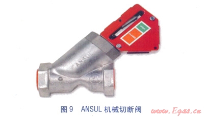 機械切斷閥(見圖9)。安裝于廚房燃?xì)饪傞y下游燃?xì)夤艿郎希?dāng)ANSUL系統(tǒng)啟動時,機械切斷閥由鋼絲繩索控制而關(guān)閉,切斷廚房燃?xì)夤?yīng),經(jīng)手動復(fù)位。