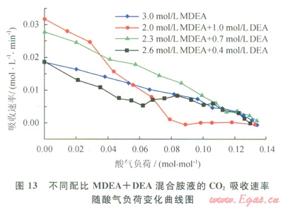 l2為不同配比MDEA+DEA混合胺液的CO2吸收速率變化曲線,圖l3為不同配比MDEA+DEA混合胺液的CO2吸收速率隨酸氣負(fù)荷變化曲線。如圖l2、13所示,隨吸收反應(yīng)的進(jìn)行、酸氣負(fù)荷的增加,4種配比MDEA+DEA混合胺液的CO2吸收速率逐漸降低,最終趨近于0MDEADEA配比為2.60.4混合胺液的CO2吸收速率變化趨勢與MDEA胺液非常接近。按初始時(shí)刻CO2吸收速率由大到小的MDEADEA配比順序?yàn)?span lang="EN-US">2.01.0、2.30.72.30.4、3.00.0、2.01.0、2.30.7,這2種配比混合胺液的CO2吸收速率隨時(shí)間降低趨勢較為劇烈,吸收達(dá)到平衡的時(shí)間較短;2.30.7配比混合胺液在同一酸氣負(fù)荷下的CO2吸收速率始終高于MDEA單一胺液;2.01.0配比混合胺液在酸氣負(fù)荷較低時(shí)保持較高水平的CO2吸收速率,但隨著酸氣負(fù)荷的增大迅速降為0。