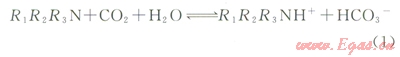 MDEA屬于叔胺,分子式表示為R1R2R3N,其中R1CH3-、R2R3CH2CH2OH-MDEACO2反應(yīng)生成亞穩(wěn)態(tài)的碳酸氫鹽,總反應(yīng)式為[8-9]