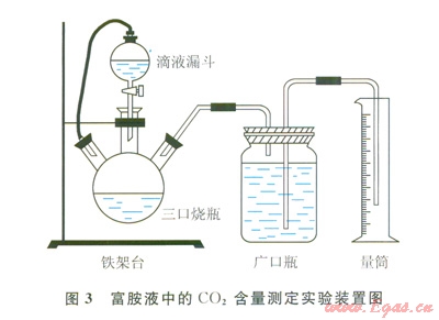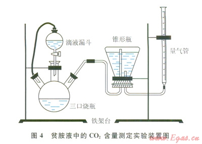 3、4分別為富胺液、貧胺液中的CO2含量檢測裝置,胺液樣品中CO2含量使用酸解法測得坫]。酸解法主要利用強(qiáng)酸置換弱酸的原理,用強(qiáng)酸H2SO4CO2從胺液中置換出來,通過測定放出的CO2氣體體積計(jì)算溶液對CO2的吸收量。
