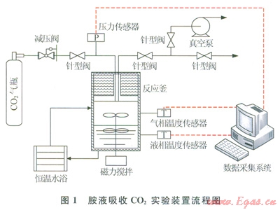 胺液吸收CO2實(shí)驗(yàn)裝置流程如圖1所示,高壓氣瓶中的原料氣經(jīng)減壓閥調(diào)壓后通入高壓反應(yīng)釜,與反應(yīng)釜內(nèi)預(yù)先充入的胺液進(jìn)行吸收反應(yīng)。其中的關(guān)鍵設(shè)備為帶有磁耦合攪拌的反應(yīng)釜。反應(yīng)釜外殼為循環(huán)夾套,恒溫水浴可提供一定溫度的導(dǎo)熱液體,用于胺液反應(yīng)過程中的溫度控制,進(jìn)行不同操作溫度的實(shí)驗(yàn)。反應(yīng)釜最外層使用保溫材料包裹,確??販匦Ч?。恒溫水浴的溫度控制范圍-20150℃,溫度波動(dòng)±0.05℃。真空泵采用水環(huán)泵,裝置抽真空度根據(jù)泵上儀表進(jìn)行監(jiān)控。采用計(jì)算機(jī)數(shù)據(jù)采集系統(tǒng),整個(gè)系統(tǒng)由數(shù)據(jù)變送器、數(shù)據(jù)采集卡和計(jì)算機(jī)構(gòu)成。