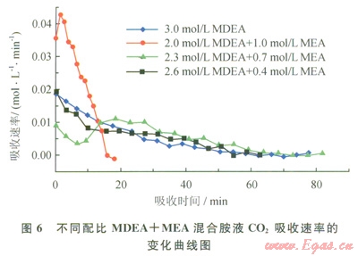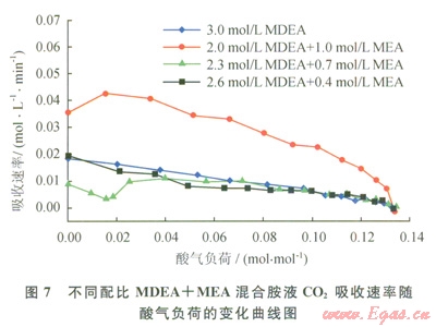 6為不同配比MDEA+MEA混合胺液CO2吸收速率的變化曲線圖,圖7為不同配比MDEA+MEA混合胺液CO2吸收速率隨酸氣負(fù)荷的變化曲線。從圖67可以看出,不同配比MDEA+MEA混合胺液隨吸收反應(yīng)的進(jìn)行,酸氣負(fù)荷逐漸增大,CO2吸收速率逐漸減小至0。MDEAMEA配比為2.01.0的混合胺液CO2吸收速率明顯高于其他配比混合胺液;MDEAMEA配比為2.30.72.60.4的混合胺液CO2吸收速率變化趨勢非常接近,與MDEA單一胺液CO2吸收速率相差不大。由此說明,2molLMDEA溶液中加入1molLMEA,其CO2吸收性能顯著提高,MEA添加量較小時(shí)對MDEACO2吸收性能并無改善。因此,MEA作為MDEA的添加劑時(shí),需要較高MEAMDEA配比才能使混合胺液表現(xiàn)出更好的CO2吸收性能。