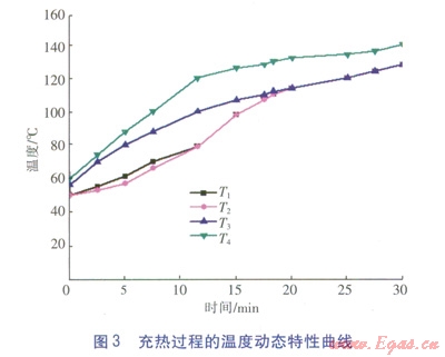 蒸汽蓄熱器是利用水的單位體積焓遠(yuǎn)大于蒸汽的特性而設(shè)計(jì)的間接存儲(chǔ)蒸汽的貯熱裝置,其中的水既是蒸汽和水進(jìn)行熱交換的傳熱介質(zhì),又是蓄存熱能的載熱體[1]。蒸汽蓄熱器的蓄熱(充熱)過程是鍋爐供給的高壓蒸汽直接與蒸汽壓較低的飽和水的混合傳熱過程。充熱裝置是蒸汽蓄熱器的一部分,見圖l。充熱過程中,工作蒸汽通過充汽分配管進(jìn)入蒸汽噴射系統(tǒng),均勻噴射入蓄熱器水空間,使蓄熱器內(nèi)水溫、水位和焓逐漸升高。充熱過程終止時(shí),蓄熱器內(nèi)儲(chǔ)存與充汽分配管等蒸汽壓的飽和水及與其相應(yīng)的焓,同時(shí)水位達(dá)到與充汽分配管底部平齊[4]。充熱過程要力求高壓蒸汽通過噴嘴盡量充分、快速、均勻地溶入到飽和水中,這要求盡量強(qiáng)化水循環(huán)的湍流擾動(dòng)。傳質(zhì)傳熱的程度和速度直接影響飽和水空間溫度場(chǎng)及蒸汽壓力與水飽和蒸汽壓之間的偏差,由此造成不可逆內(nèi)部熱損失隨充熱時(shí)間的增加而增加。充熱過程動(dòng)態(tài)特性曲線見圖2、3。