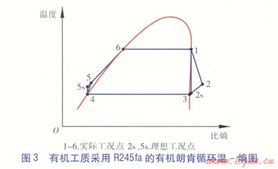 有機工質采用R245fa的有機朗肯循環(huán)溫一熵圖見圖3。1-2為工質在透平內實際膨脹做功過程,1-2s為工質在透平內等熵膨脹做功過程;2(2s)-3-4為工質在冷凝器中的定壓(也定溫)的冷凝過程;4-5為工質在工質泵中實際壓縮過程,4-5s為工質在工質泵中的等熵壓縮過程;5(5s)-6為工質在蒸發(fā)器內由未飽和狀態(tài)定壓加熱到飽和狀態(tài)過程;6-1為工質在蒸發(fā)器內由飽和液態(tài)加熱到飽和氣態(tài)過程。在熱力學模型建立過程中,進行以下設定:忽略管道、蒸發(fā)器、冷凝器中工質的壓降,每個組成部件認為是一個穩(wěn)態(tài)穩(wěn)定流動的單元。
