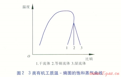 有機工質對有機朗循環(huán)發(fā)電系統(tǒng)的性能影響較大。有機工質可根據(jù)溫-熵圖飽和節(jié)氣曲線的右半部分的斜率分3(見圖2):第一類:斜率為負的濕流體,這些流體的等熵膨脹易產(chǎn)生凝結現(xiàn)象,在透平內膨脹做功后凝結,易對透平造成危害。第二類:斜率為正的干流體。第三類:近似垂直的等熵流體。干流體與等熵流體可避免濕流體造成的危害,另外還應要考慮有機工質的熱力學性能和環(huán)保特性。