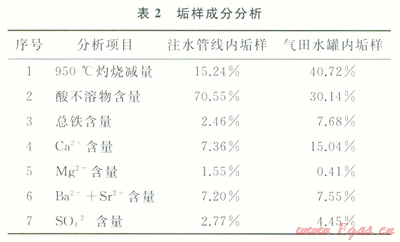 在對(duì)白馬8井氣田水罐清洗后發(fā)現(xiàn),罐內(nèi)已形成大塊片狀垢樣,垢樣顏色呈棕黃色;而在注水管線內(nèi)垢樣的橫截面上大多是顏色較深的層狀細(xì)條紋,有明顯的界面痕跡,分布均勻,垢樣內(nèi)表面大都粗糙不平,有豆?fàn)铑w粒,垢樣較硬,滴鹽酸發(fā)生少量起泡,由此可以判斷結(jié)垢物主要成分不是常見(jiàn)的碳酸鹽層狀垢樣。